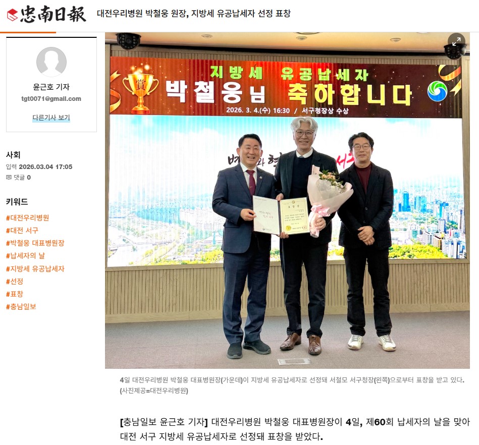 [Ãæ³²ÀϺ¸] ´ëÀü¿ì¸®º´¿ø ¹Úö¿õ ¿øÀå, Áö¹æ¼¼ À¯°ø³³¼¼ÀÚ ¼±Á¤ ǥâ