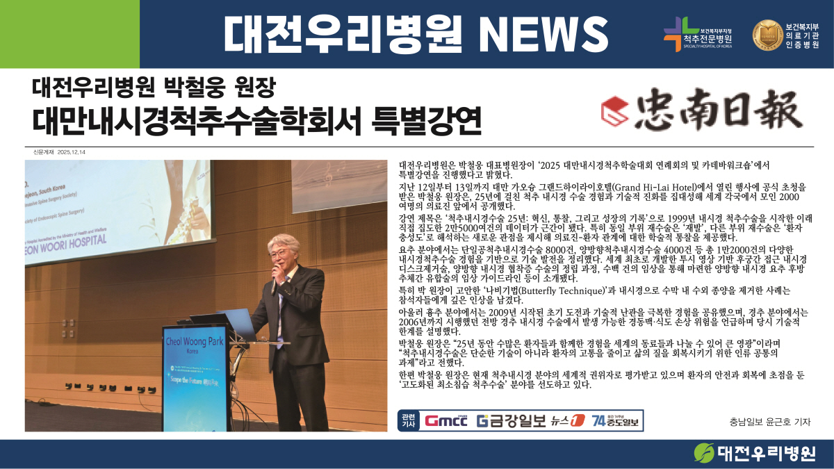 [Ãæ³²ÀϺ¸] ´ëÀü¿ì¸®º´¿ø ¹Úö¿õ ¿øÀå, ´ë¸¸³»½Ã°æÃ´Ãß¼ö¼úÇÐȸ¼ Ưº°°¿¬