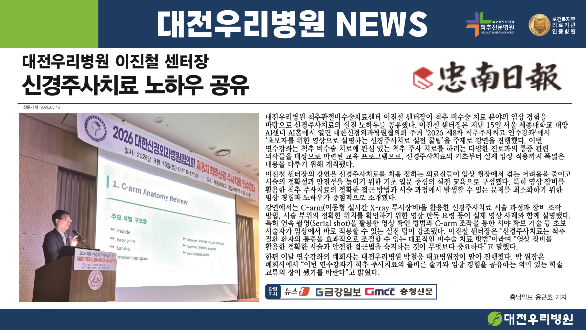[Ãæ³²ÀϺ¸] ´ëÀü¿ì¸®º´¿ø ÀÌÁøÃ¶ ¼¾ÅÍÀå, ½Å°æÁÖ»çÄ¡·á ³ëÇÏ¿ì °øÀ¯
