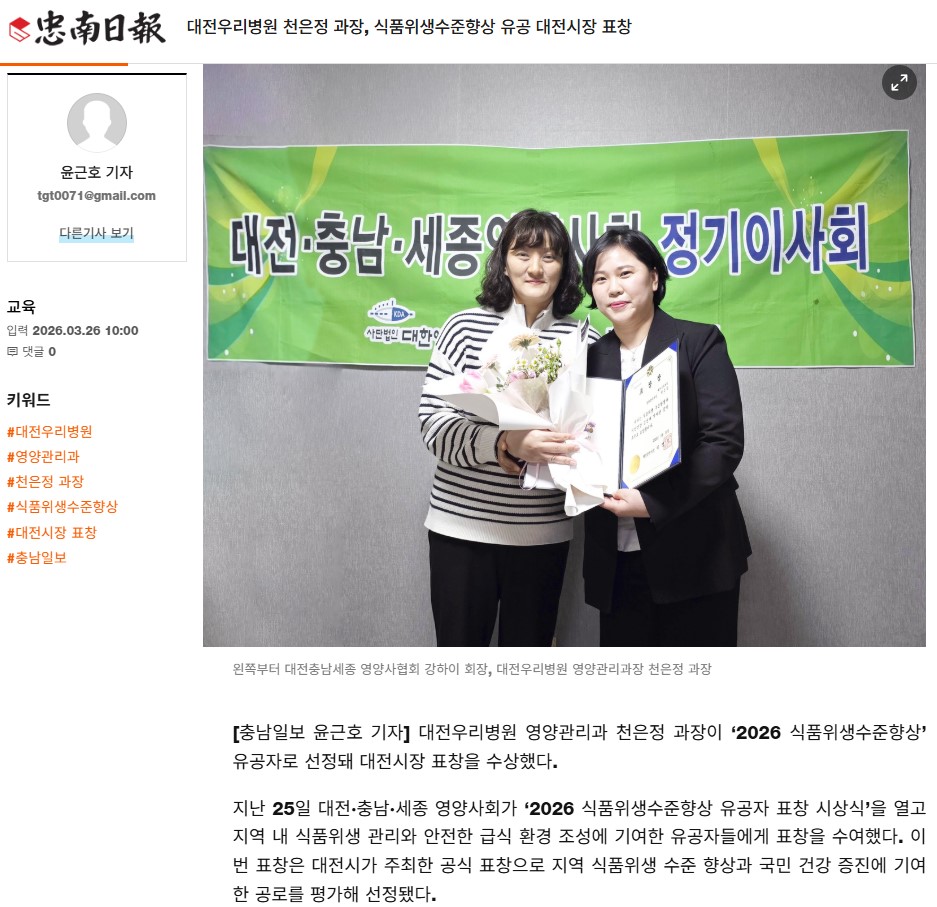 [Ãæ³²ÀϺ¸] ´ëÀü¿ì¸®º´¿ø õÀºÁ¤ °úÀå, ½ÄǰÀ§»ý¼öÁØÇâ»ó À¯°ø ´ëÀü½ÃÀå ǥâ