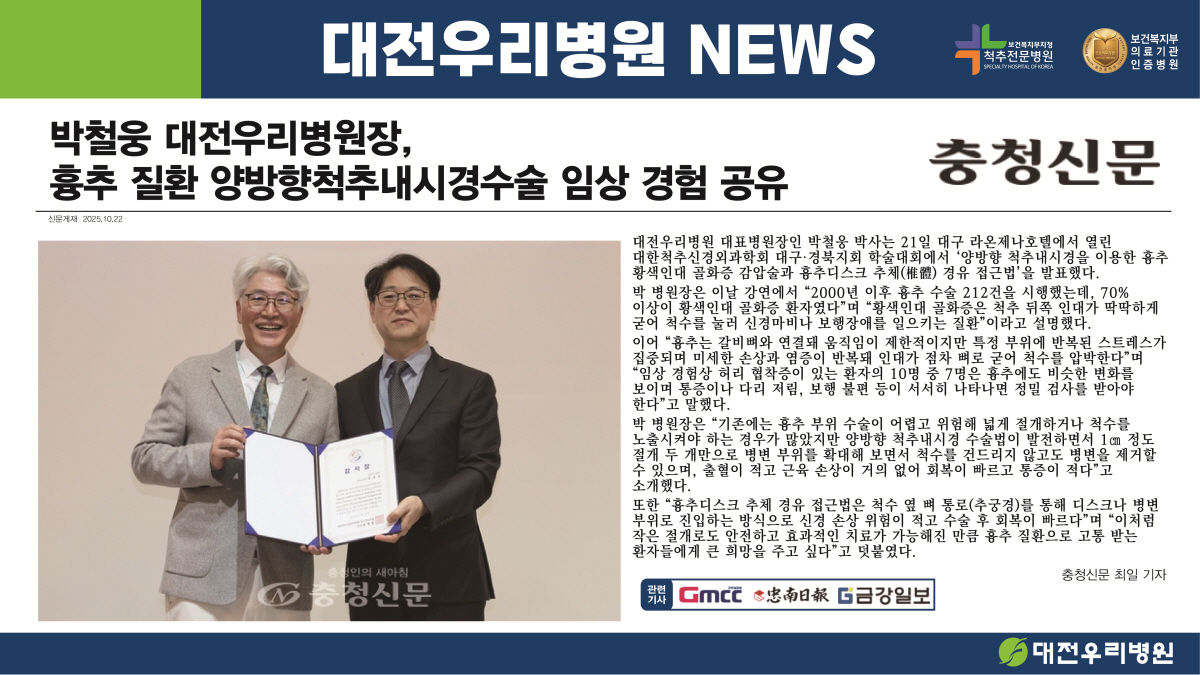 [ÃæÃ»½Å¹®] ¹Úö¿õ ´ëÀü¿ì¸®º´¿øÀå, ÈäÃß Áúȯ ¾ç¹æÇâôÃß³»½Ã°æ¼ö¼ú ÀÓ»ó °æÇè °øÀ¯