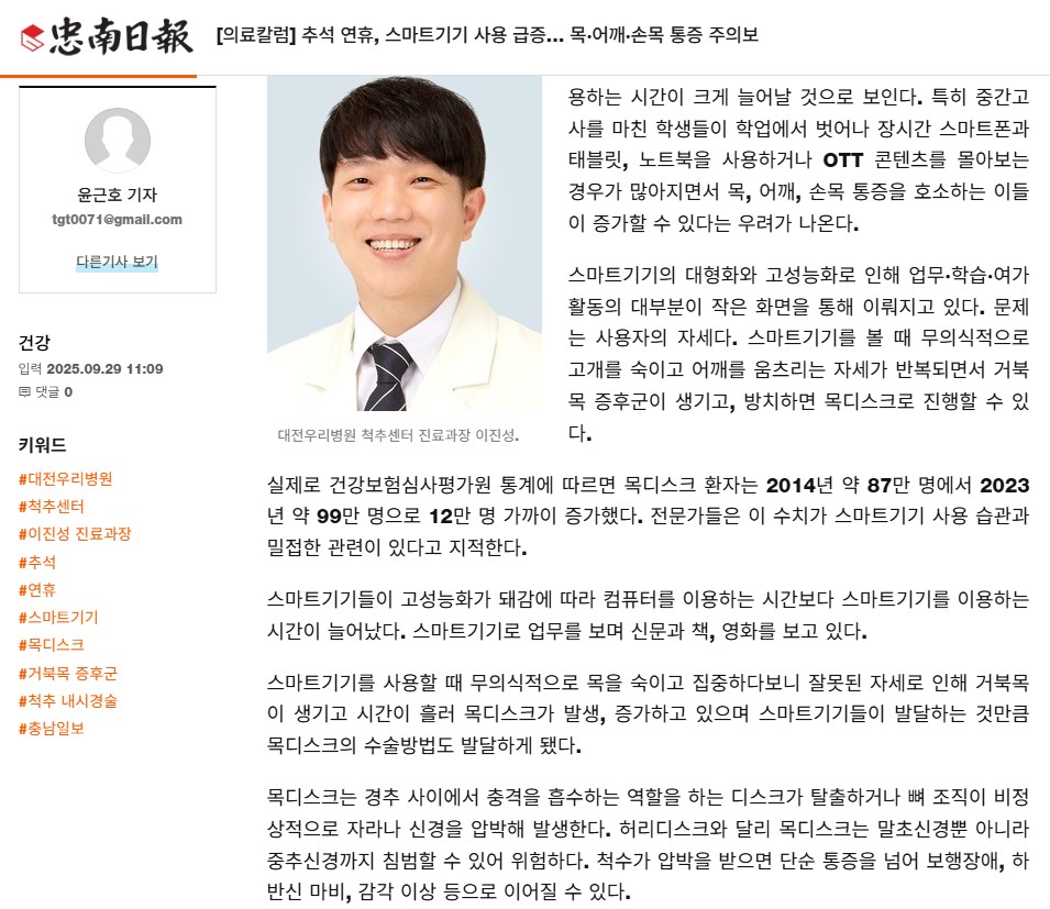 [Ãæ³²ÀϺ¸] [ÀÇ·áÄ®·³] Ãß¼® ¿¬ÈÞ, ½º¸¶Æ®±â±â »ç¿ë ±ÞÁõ¡¦ ¸ñ¡¤¾î±ú¡¤¼Õ¸ñ ÅëÁõ ÁÖÀǺ¸