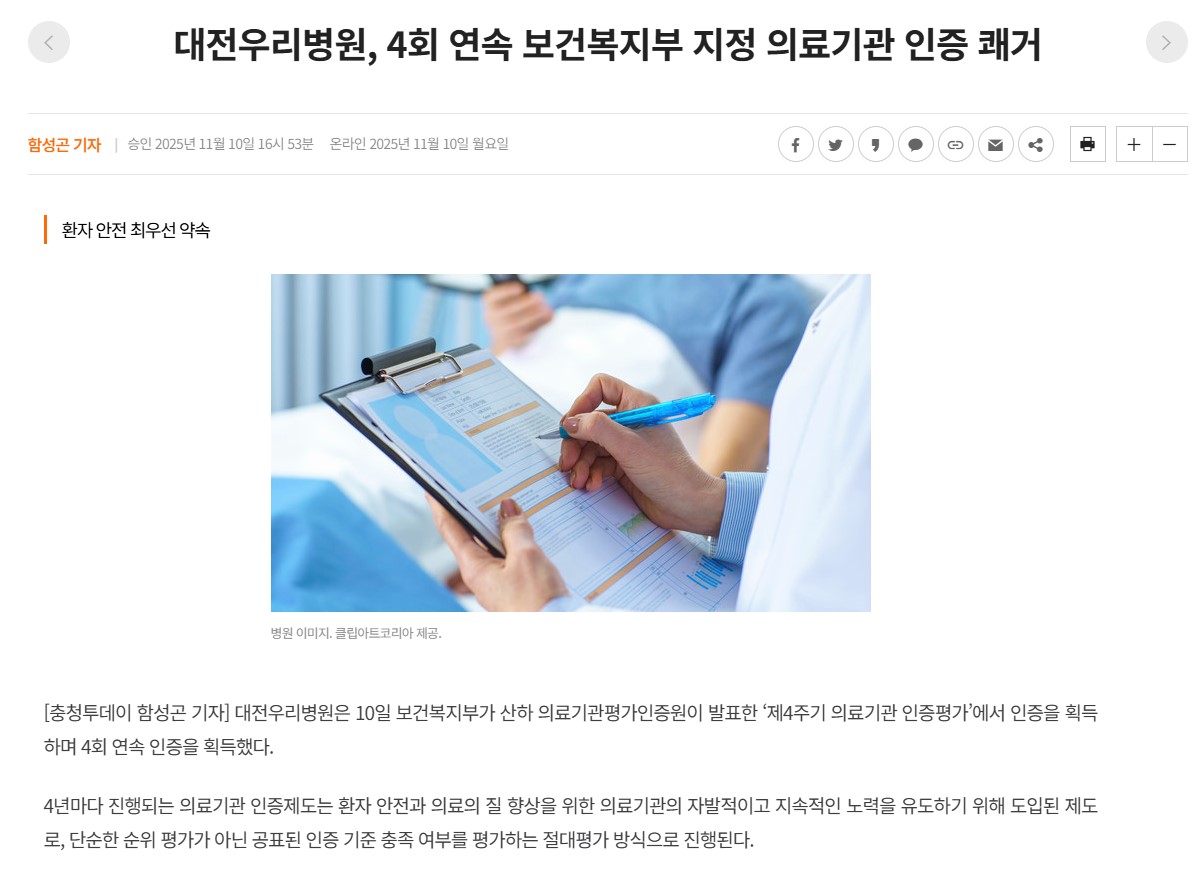 [ÃæÃ»Åõµ¥ÀÌ] ´ëÀü¿ì¸®º´¿ø, 4ȸ ¿¬¼Ó º¸°Çº¹ÁöºÎ ÁöÁ¤ ÀÇ·á±â°ü ÀÎÁõ Äè°Å