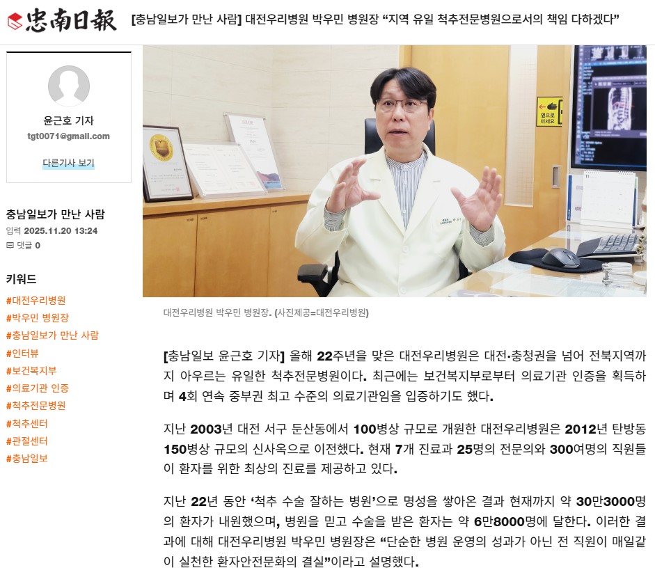 [Ãæ³²ÀϺ¸] [Ãæ³²ÀϺ¸°¡ ¸¸³ »ç¶÷] ´ëÀü¿ì¸®º´¿ø ¹Ú¿ì¹Î º´¿øÀå ¡°Áö¿ª À¯ÀÏ Ã´ÃßÀü¹®º´¿øÀ¸·Î¼ÀÇ Ã¥ÀÓ ´ÙÇϰڴ١±