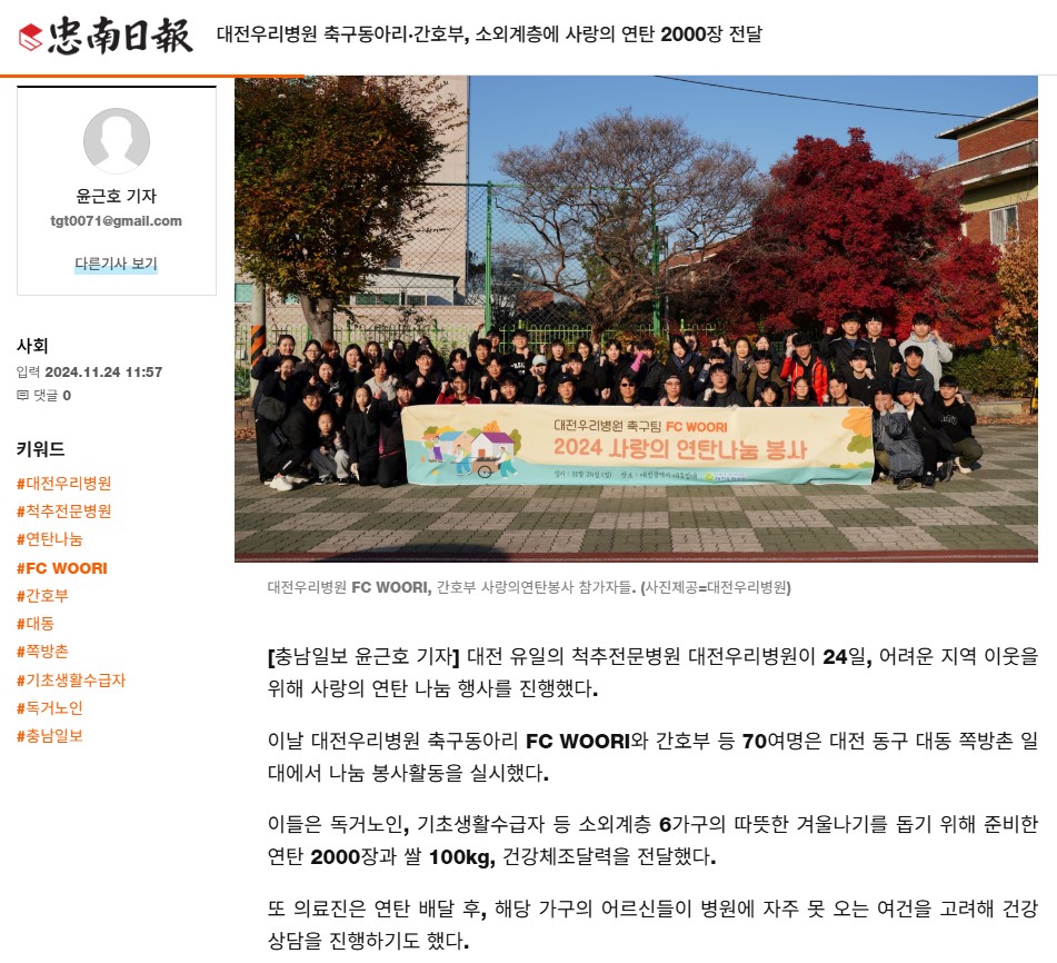 [Ãæ³²ÀϺ¸] ´ëÀü¿ì¸®º´¿ø Ã౸µ¿¾Æ¸®¡¤°£È£ºÎ, ¼Ò¿Ü°èÃþ¿¡ »ç¶ûÀÇ ¿¬Åº 2000Àå Àü´Þ