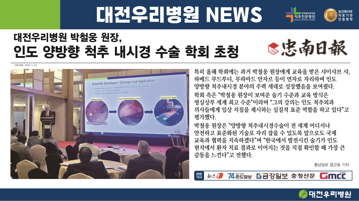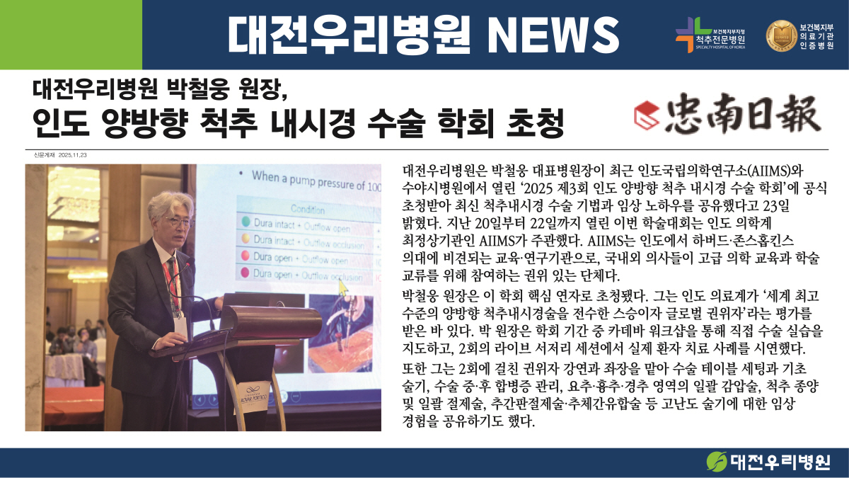[Ãæ³²ÀϺ¸] ´ëÀü¿ì¸®º´¿ø ¹Úö¿õ ¿øÀå, Àεµ ¾ç¹æÇâ ôÃß ³»½Ã°æ ¼ö¼ú ÇÐȸ ÃÊû