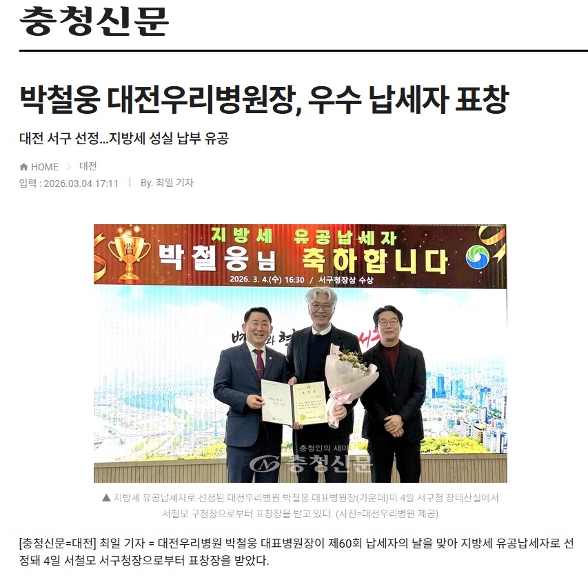 [ÃæÃ»½Å¹®] ¹Úö¿õ ´ëÀü¿ì¸®º´¿øÀå, ¿ì¼ö ³³¼¼ÀÚ Ç¥Ã¢