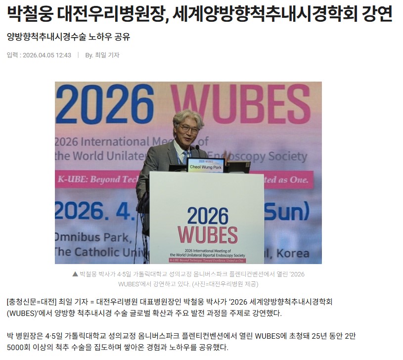 [ÃæÃ»½Å¹®] ¹Úö¿õ ´ëÀü¿ì¸®º´¿øÀå, ¼¼°è¾ç¹æÇâôÃß³»½Ã°æÇÐȸ °¿¬