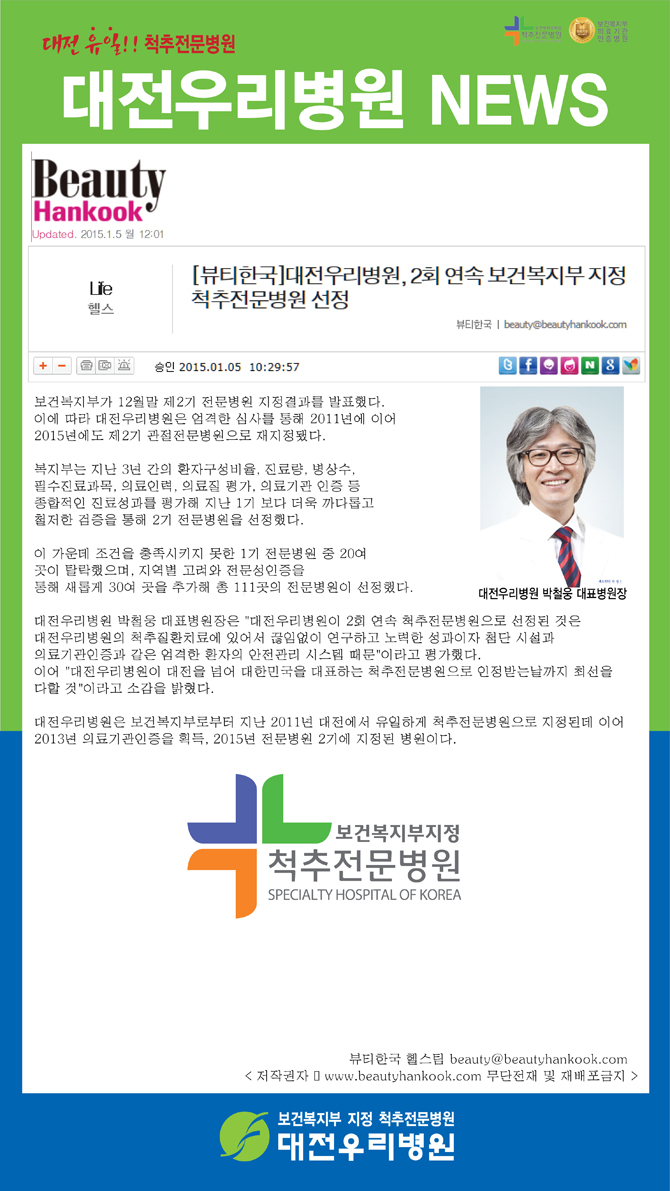[ºäƼÇѱ¹] ´ëÀü¿ì¸®º´¿ø, 2ȸ ¿¬¼Ó º¸°Çº¹ÁöºÎ ÁöÁ¤ ôÃßÀü¹®º´¿ø ¼±Á¤
