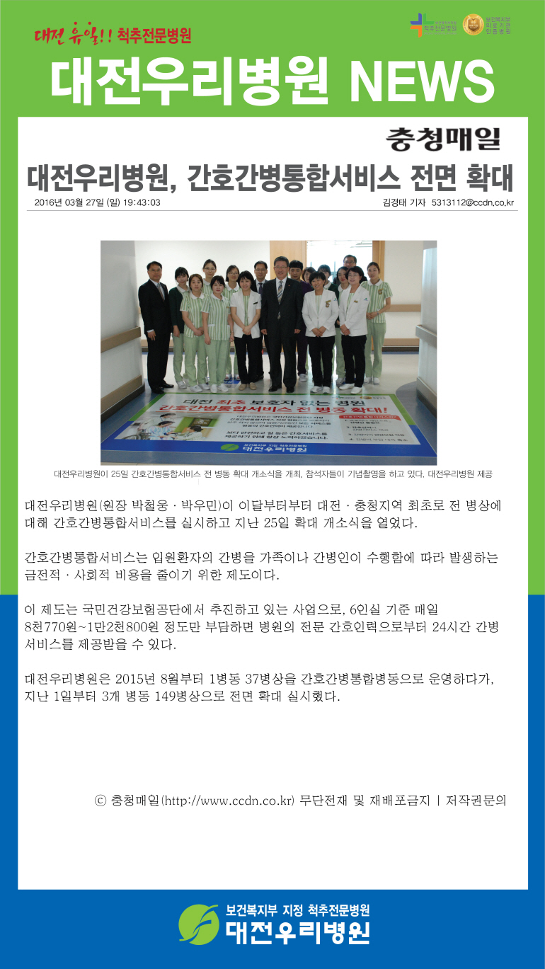 [ÃæÃ»¸ÅÀÏ] ´ëÀü¿ì¸®º´¿ø, °£È£°£º´ÅëÇÕ¼ºñ½º Àü¸é È®´ë