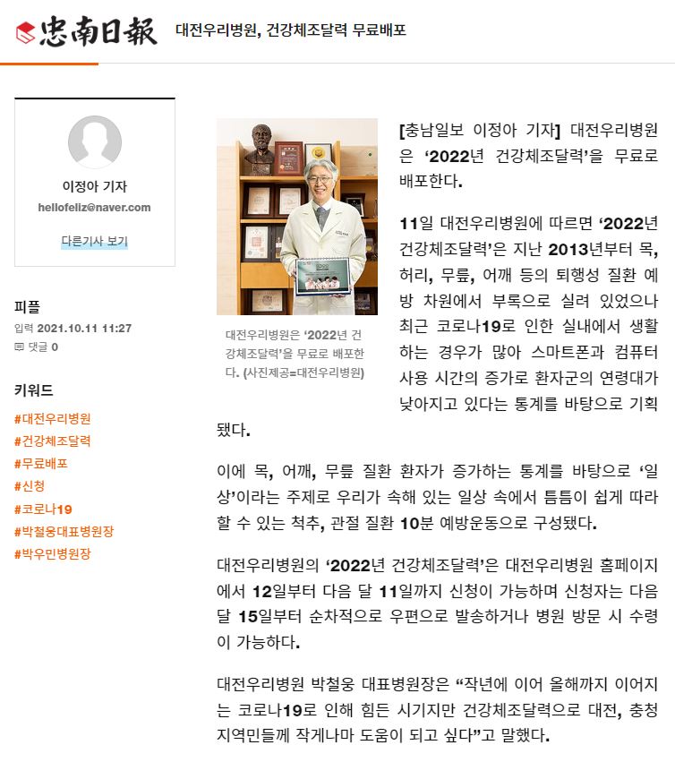 [Ãæ³²ÀϺ¸] 211011 ´ëÀü¿ì¸®º´¿ø, °Ç°Ã¼Á¶´Þ·Â ¹«·á¹èÆ÷