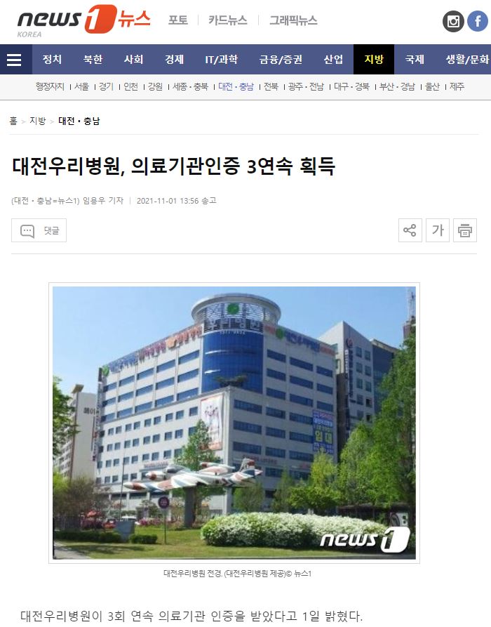 [news1] 211101 ´ëÀü¿ì¸®º´¿ø, ÀÇ·á±â°üÀÎÁõ 3¿¬¼Ó ȹµæ