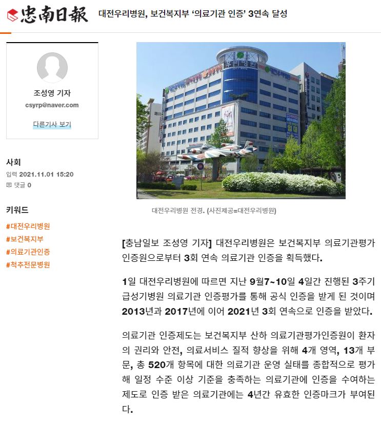 [Ãæ³²ÀϺ¸] 211101 ´ëÀü¿ì¸®º´¿ø, º¸°Çº¹ÁöºÎ ¡®ÀÇ·á±â°ü ÀÎÁõ¡¯ 3¿¬¼Ó ´Þ¼º