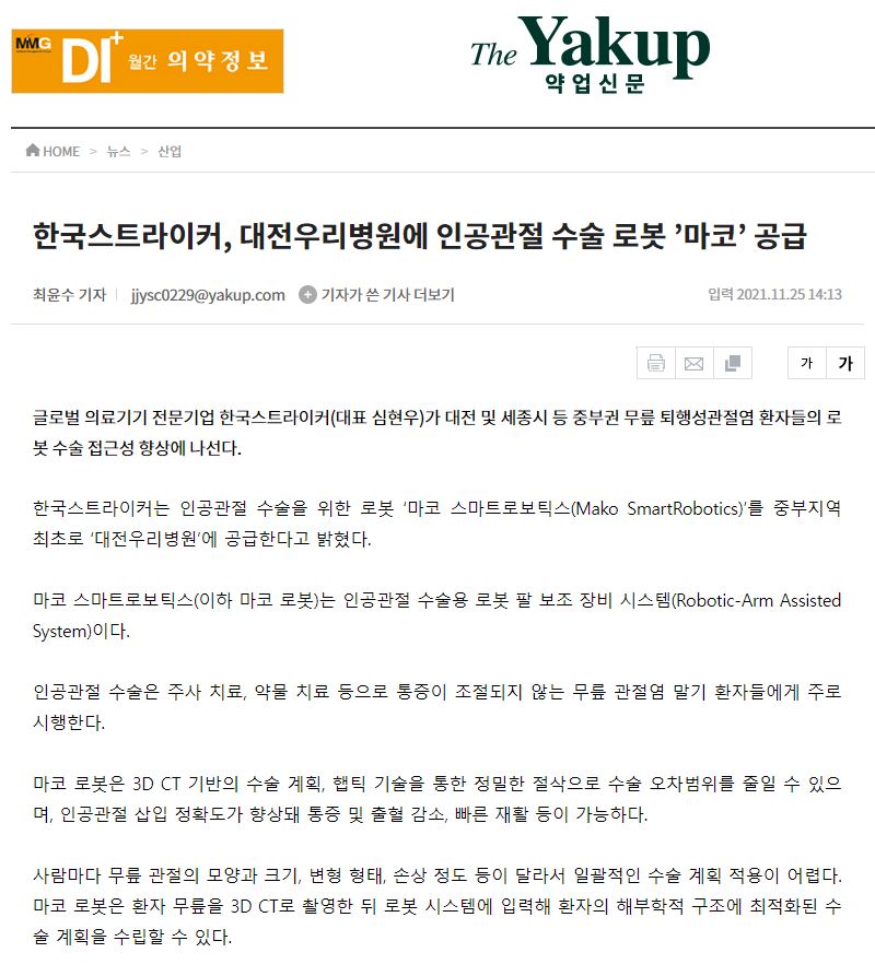 [¾à¾÷½Å¹®] 211125 Çѱ¹½ºÆ®¶óÀÌÄ¿, ´ëÀü¿ì¸®º´¿ø¿¡ Àΰø°üÀý ¼ö¼ú ·Îº¿ ¡¯¸¶ÄÚ¡¯ °ø±Þ