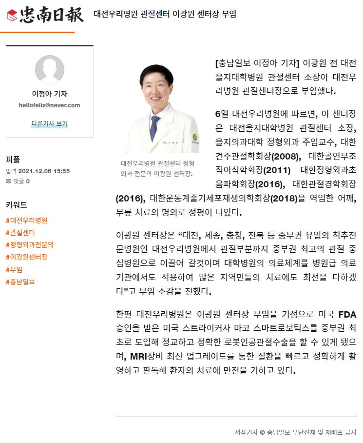 [Ãæ³²ÀϺ¸] 211206 ´ëÀü¿ì¸®º´¿ø °üÀý¼¾ÅÍ À̱¤¿ø ¼¾ÅÍÀå ºÎÀÓ