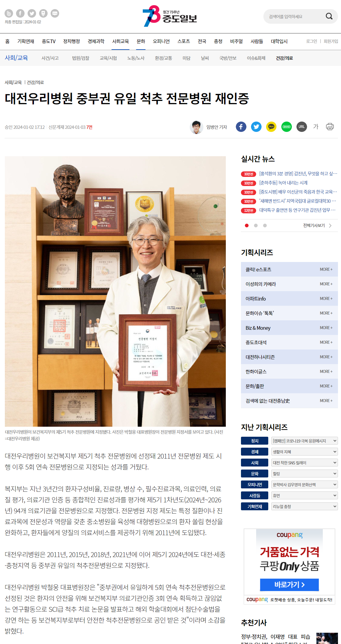 [ÁßµµÀϺ¸] ´ëÀü¿ì¸®º´¿ø ÁßºÎ±Ç À¯ÀÏ Ã´Ãß Àü¹®º´¿ø ÀçÀÎÁõ