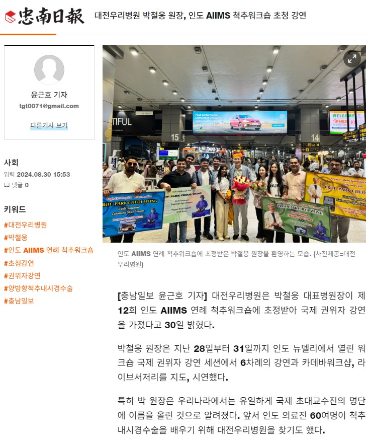 [Ãæ³²ÀϺ¸] ´ëÀü¿ì¸®º´¿ø ¹Úö¿õ ¿øÀå, Àεµ AIIMS ôÃß¿öÅ©¼ó ÃÊû °¿¬