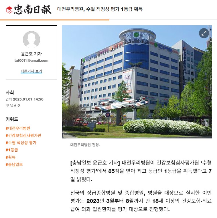 [Ãæ³²ÀϺ¸] ´ëÀü¿ì¸®º´¿ø, ¼öÇ÷ ÀûÁ¤¼º Æò°¡ 1µî±Þ ȹµæ