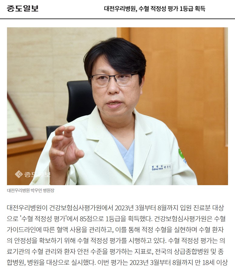 [ÁßµµÀϺ¸] ´ëÀü¿ì¸®º´¿ø, ¼öÇ÷ ÀûÁ¤¼º Æò°¡ 1µî±Þ ȹµæ