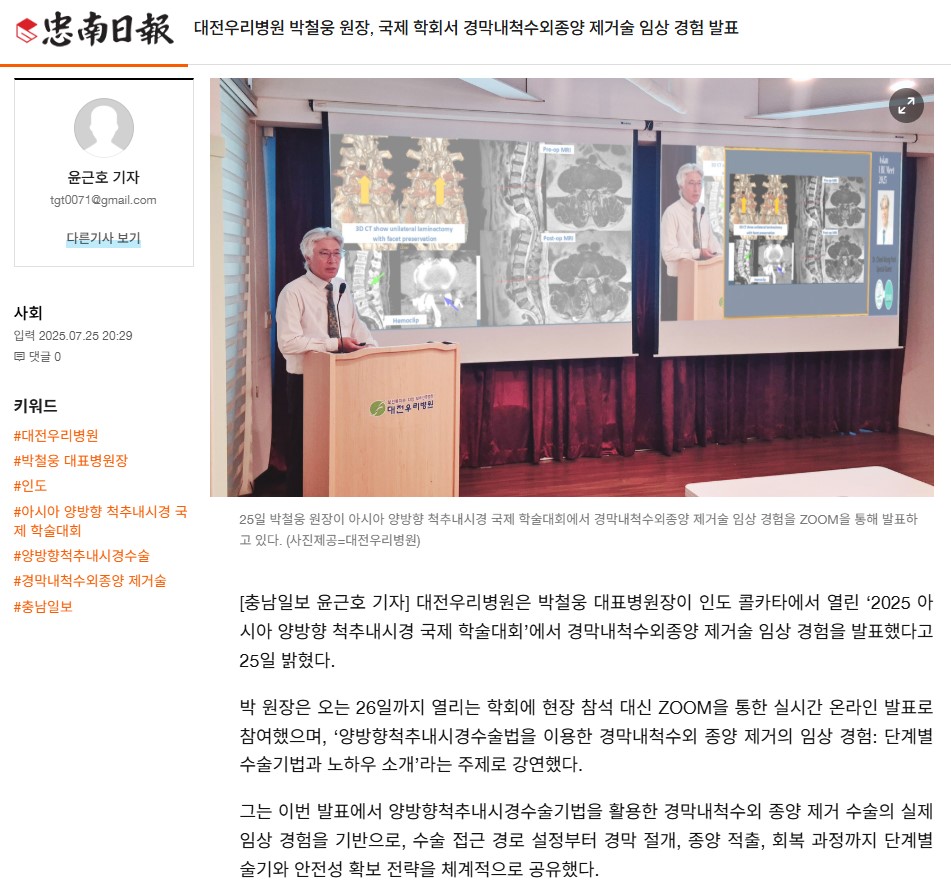 [Ãæ³²ÀϺ¸] ´ëÀü¿ì¸®º´¿ø ¹Úö¿õ ¿øÀå, ±¹Á¦ ÇÐȸ¼ °æ¸·³»Ã´¼ö¿ÜÁ¾¾ç Á¦°Å¼ú ÀÓ»ó °æÇè ¹ßÇ¥
