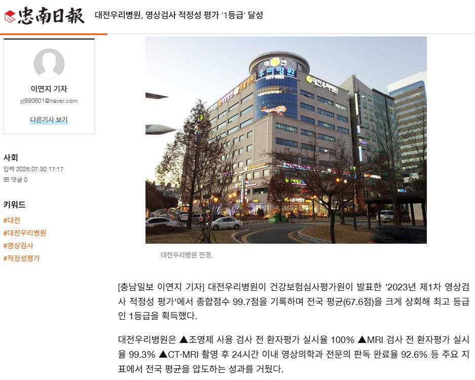 [Ãæ³²ÀϺ¸] ´ëÀü¿ì¸®º´¿ø, ¿µ»ó°Ë»ç ÀûÁ¤¼º Æò°¡ '1µî±Þ' ´Þ¼º