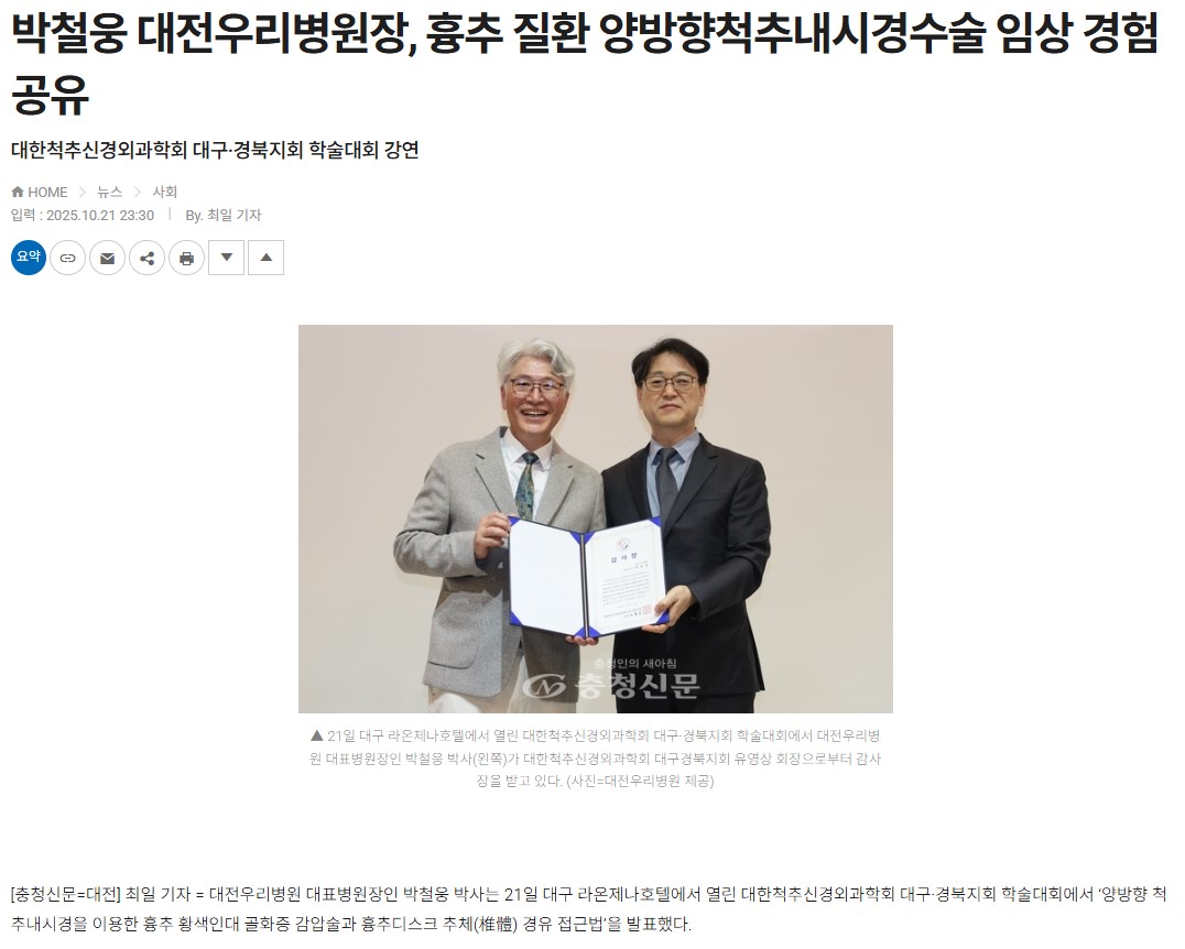 [ÃæÃ»½Å¹®] ¹Úö¿õ ´ëÀü¿ì¸®º´¿øÀå, ÈäÃß Áúȯ ¾ç¹æÇâôÃß³»½Ã°æ¼ö¼ú ÀÓ»ó °æÇè °øÀ¯