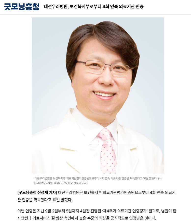 [±Â¸ð´×ÃæÃ»] ´ëÀü¿ì¸®º´¿ø, º¸°Çº¹ÁöºÎ·ÎºÎÅÍ 4ȸ ¿¬¼Ó ÀÇ·á±â°ü ÀÎÁõ