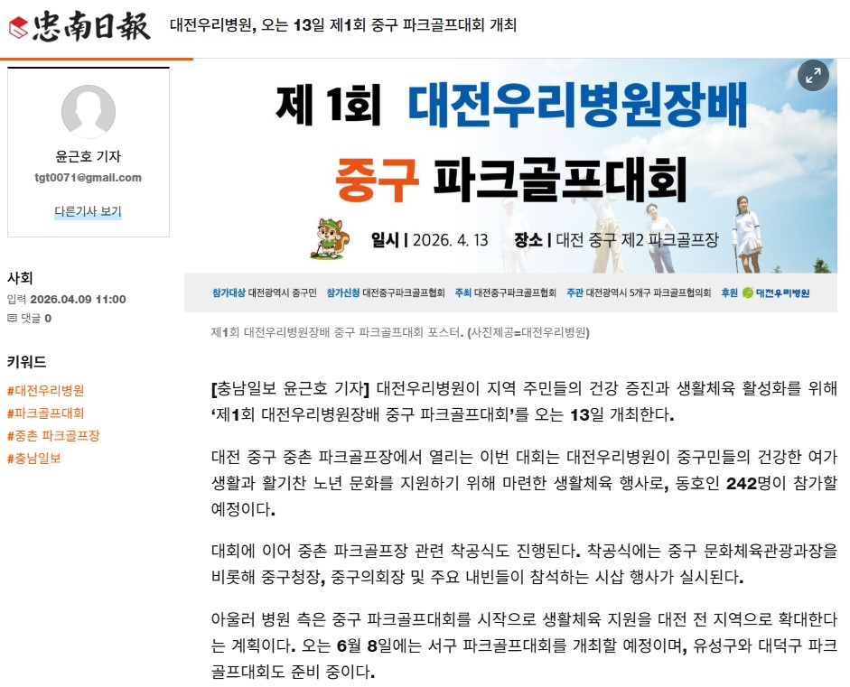 [Ãæ³²ÀϺ¸] ´ëÀü¿ì¸®º´¿ø, ¿À´Â 13ÀÏ Á¦1ȸ Áß±¸ ÆÄÅ©°ñÇÁ´ëȸ °³ÃÖ