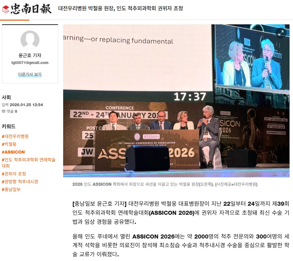 [Ãæ³²ÀϺ¸] ´ëÀü¿ì¸®º´¿ø ¹Úö¿õ ¿øÀå, Àεµ ôÃ߿ܰúÇÐȸ ±ÇÀ§ÀÚ ÃÊû