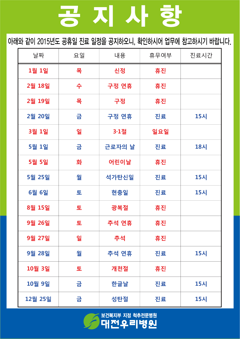 2015³â °øÈÞÀÏ ¿Ü·¡Áø·á ÀÏÁ¤À» ¾Æ·¡¿Í °°ÀÌ ¾Ë·Áµå¸³´Ï´Ù.